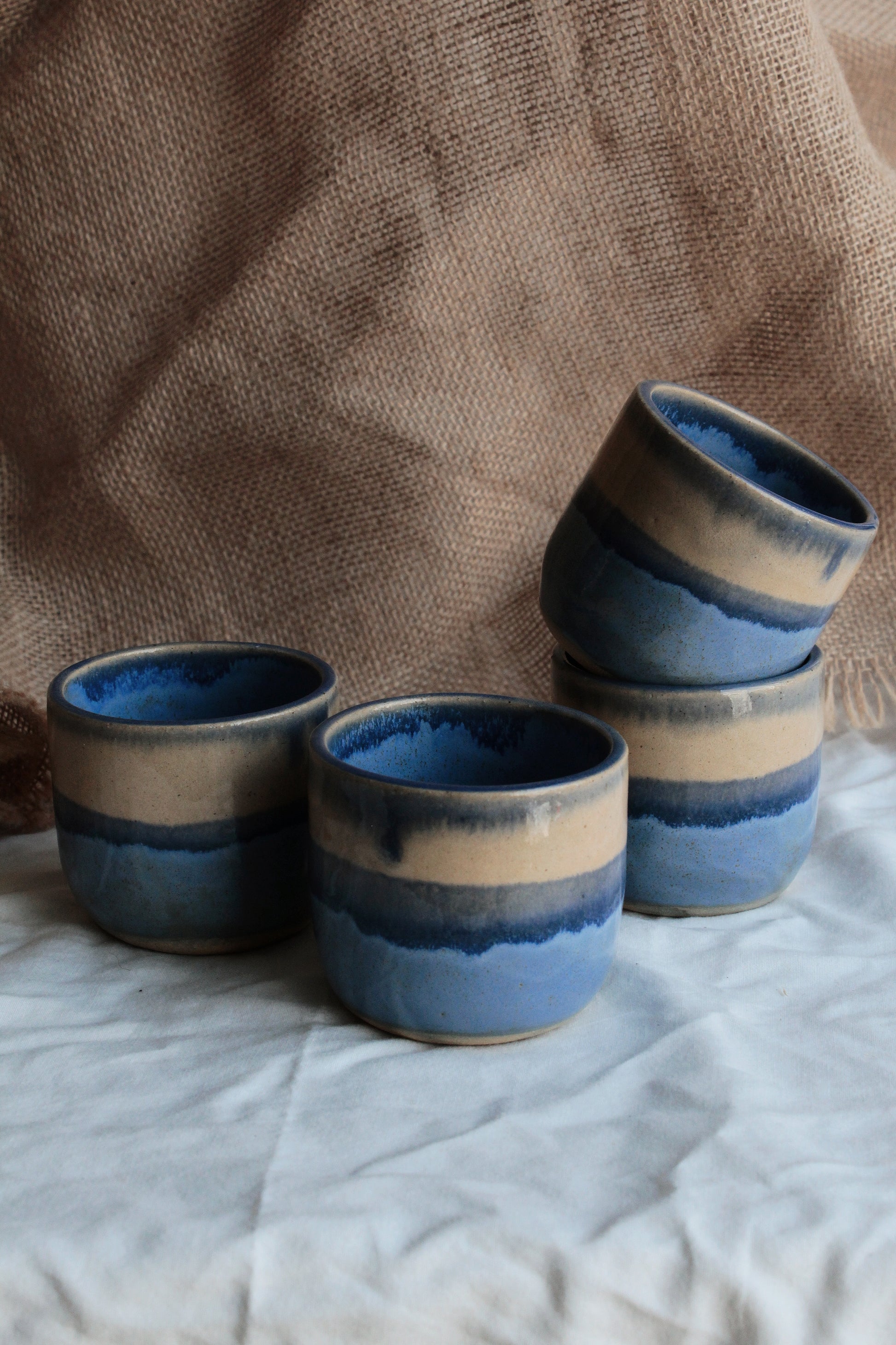 El Juego de 4 Tazas Bahía captura la calma del océano en sus tonos azules profundos, evocando esas mañanas lentas y los rituales compartidos que invitan a disfrutar el presente.